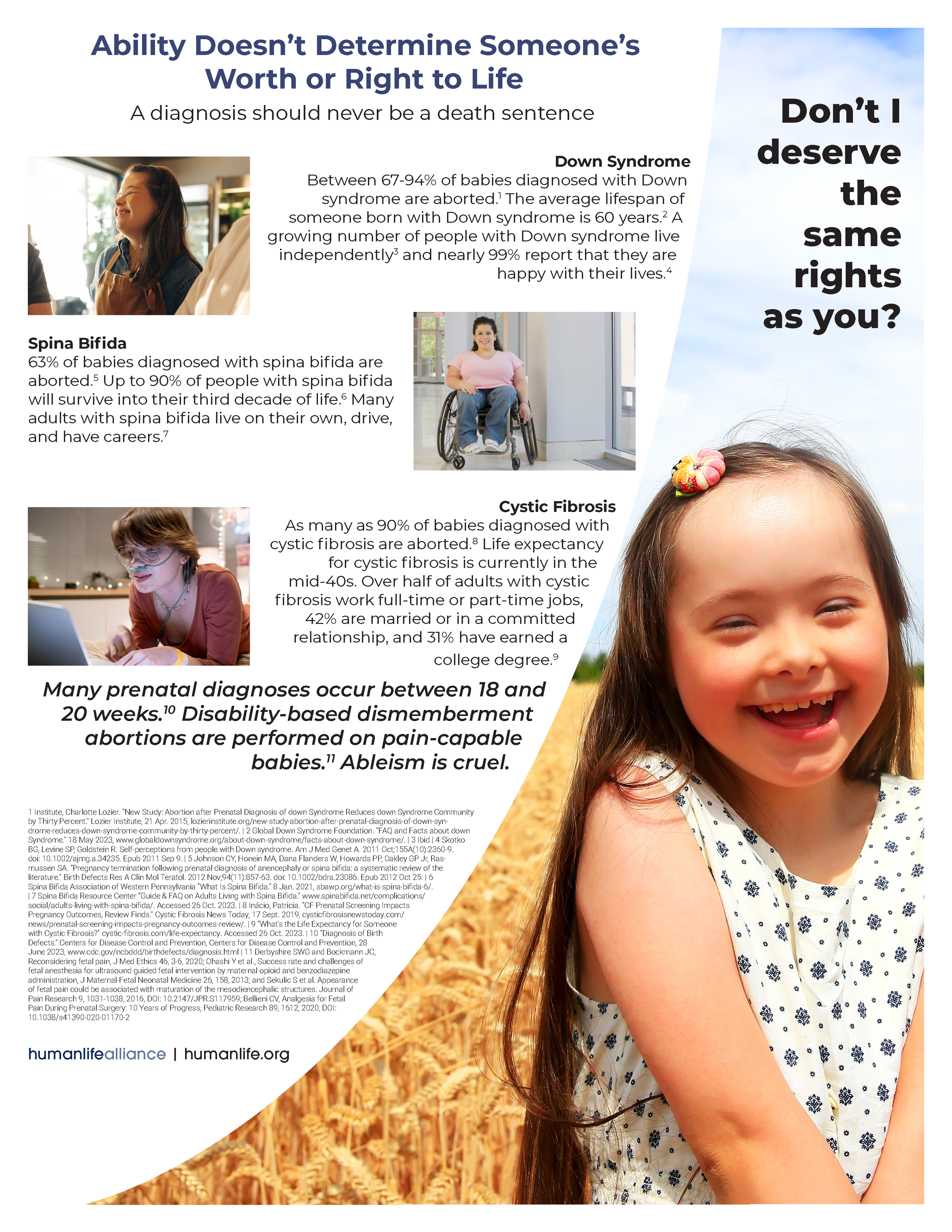 Abortion is ableism at its most lethal. This fact sheet presents the truth about the lives cut short by disability-based abortions. Purchase "In House Printing" from Human Life Alliance, or download a digital file of this sheet for FREE.